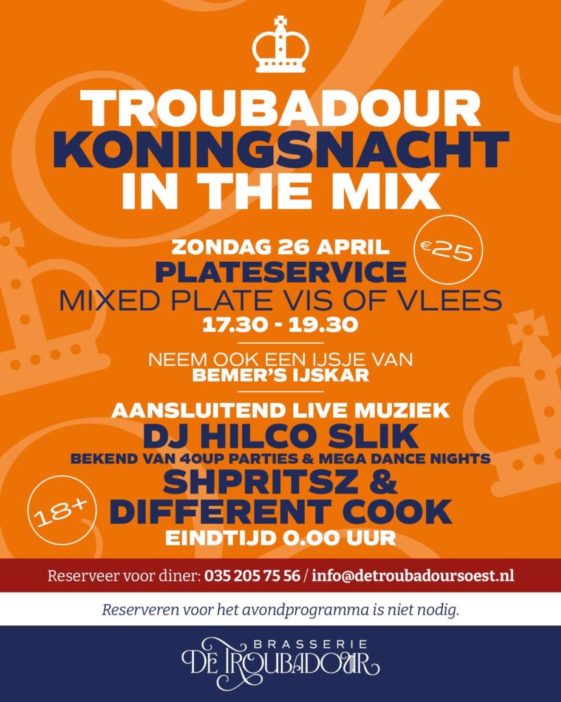 Ook de Horeca in Soest en Soesterberg kleurt Oranje en op diverse terrassen is er live-muziek en/of entertainment, zoals bij Grand Café De Lindenhof, Sabrosa Kitchen & Bar, .