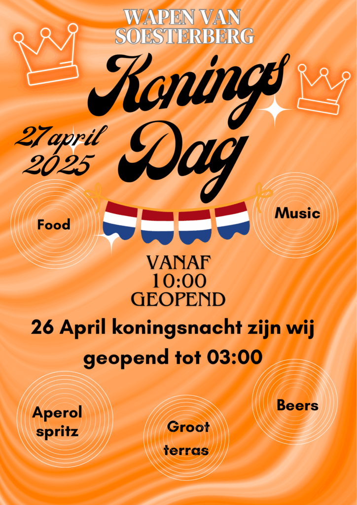 Ook de Horeca in Soest en Soesterberg kleurt Oranje en op diverse terrassen is er live-muziek en/of entertainment, zoals bij Grand Café De Lindenhof, Sabrosa Kitchen & Bar, het Wapen van Soesterberg.